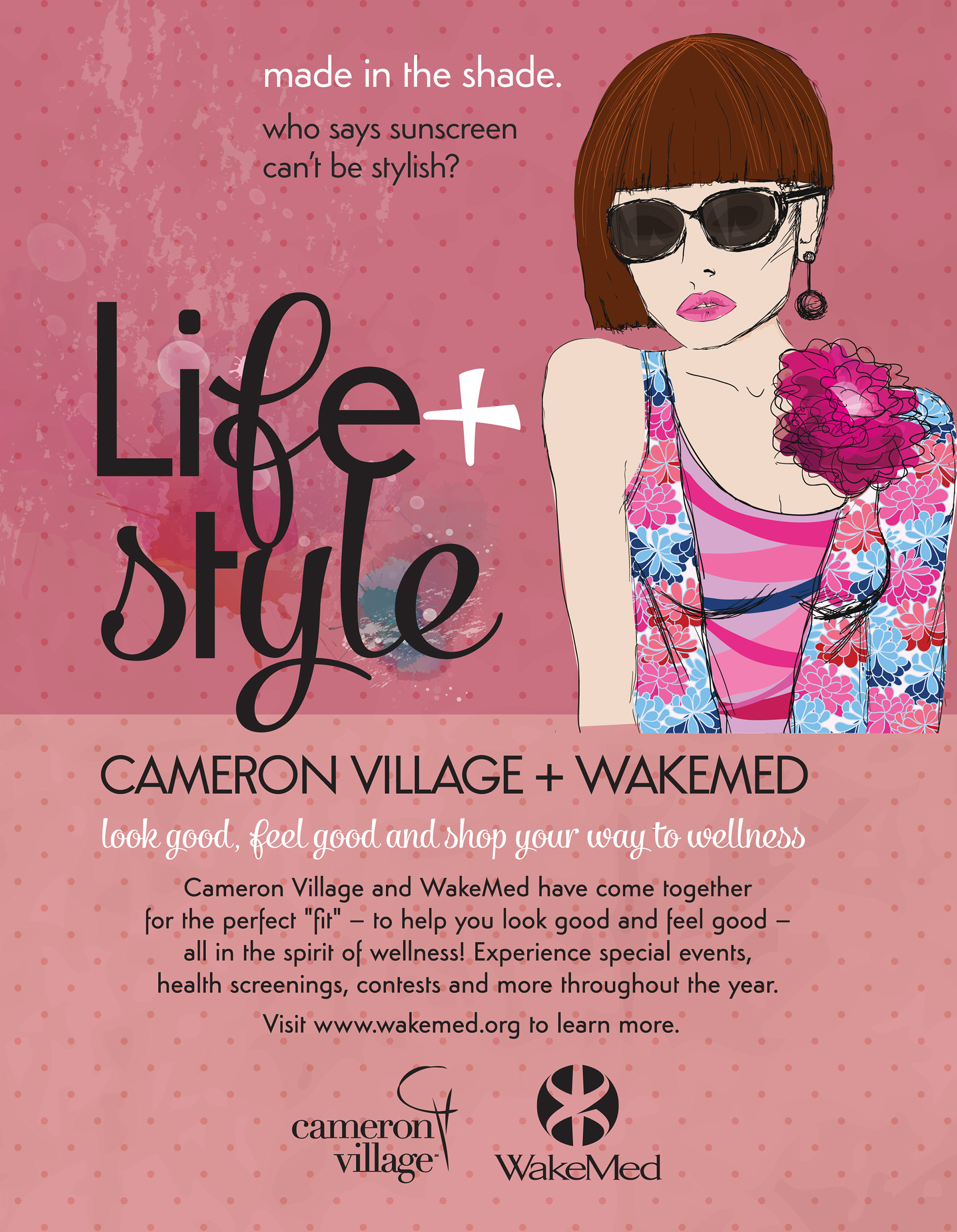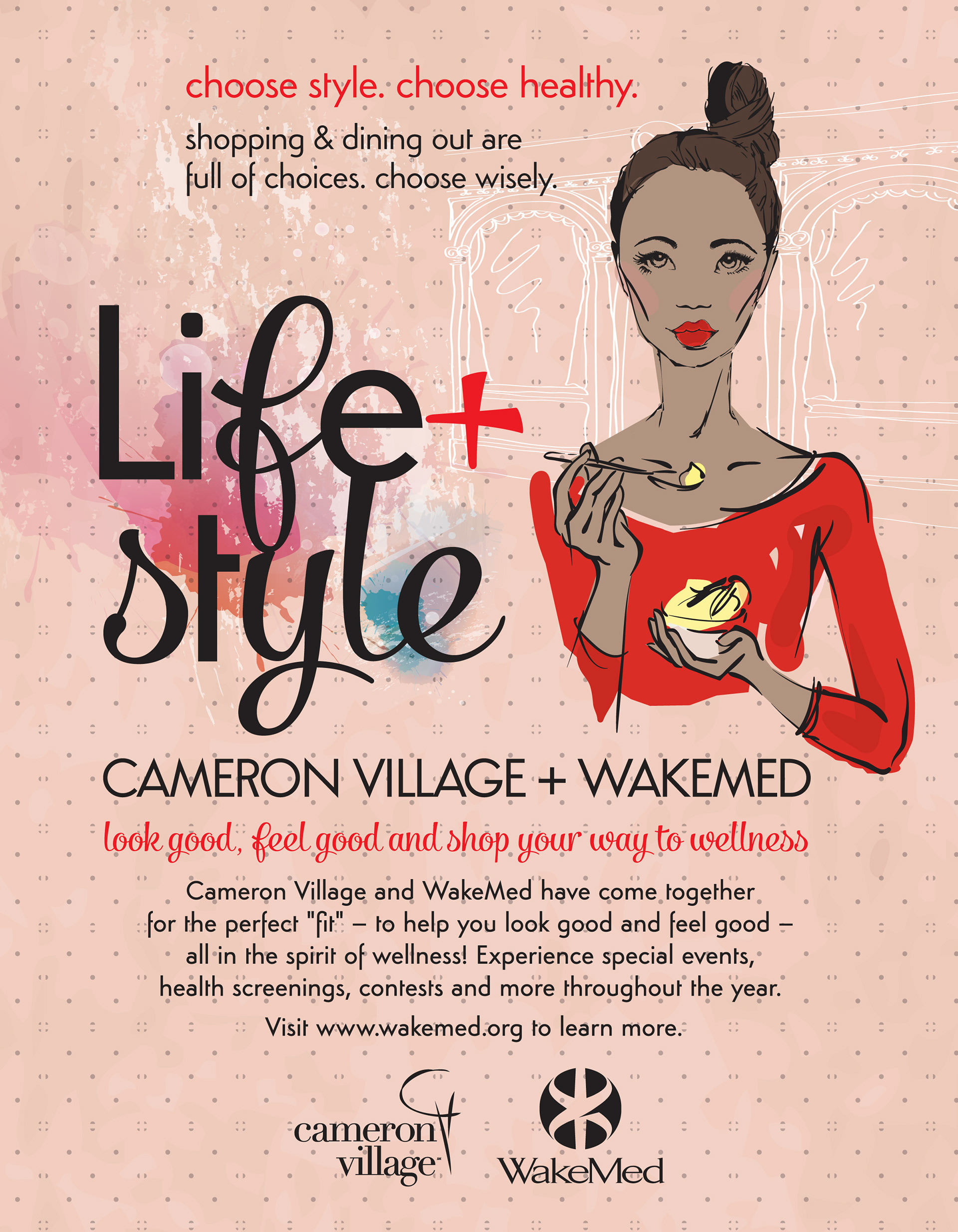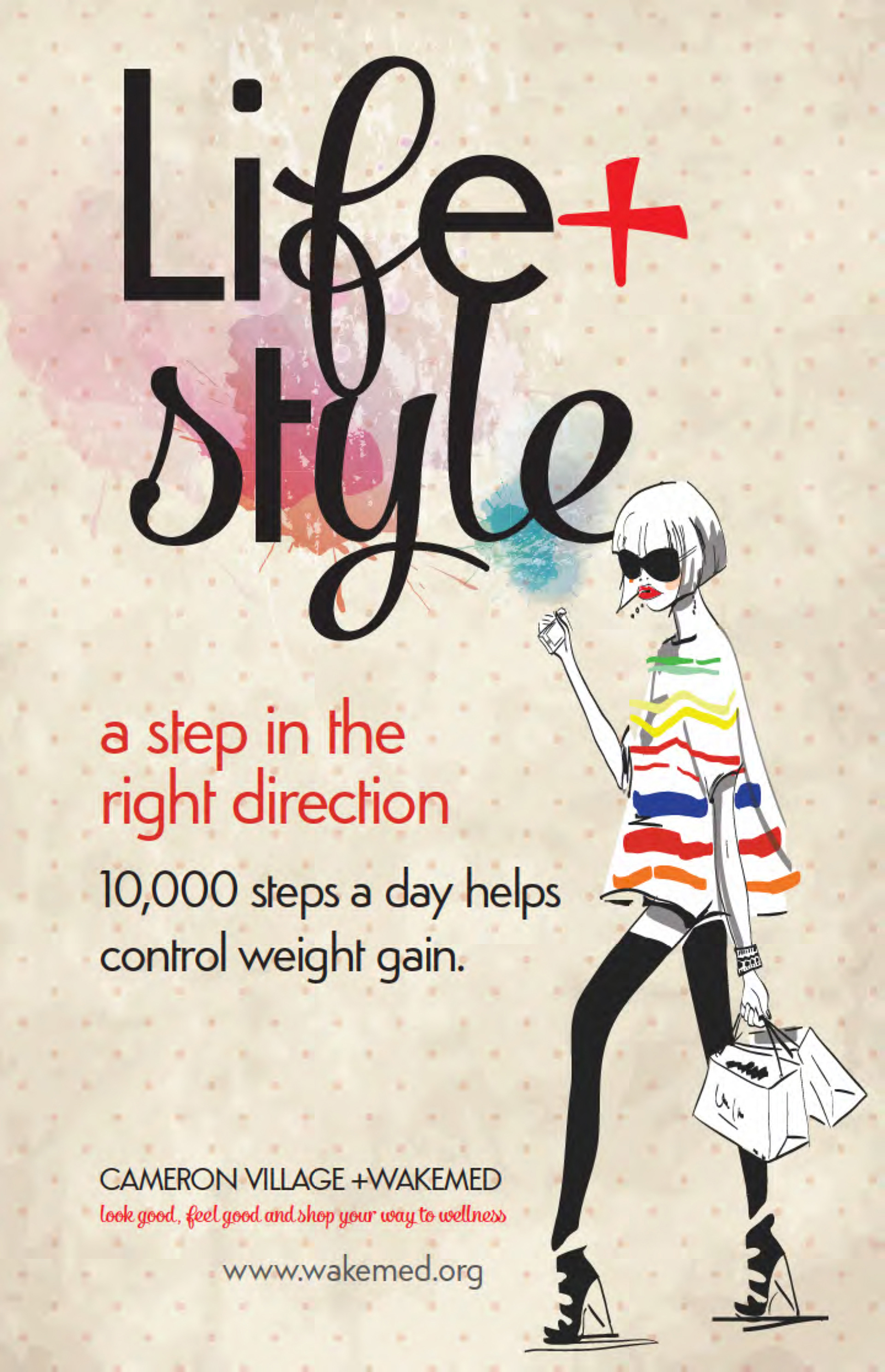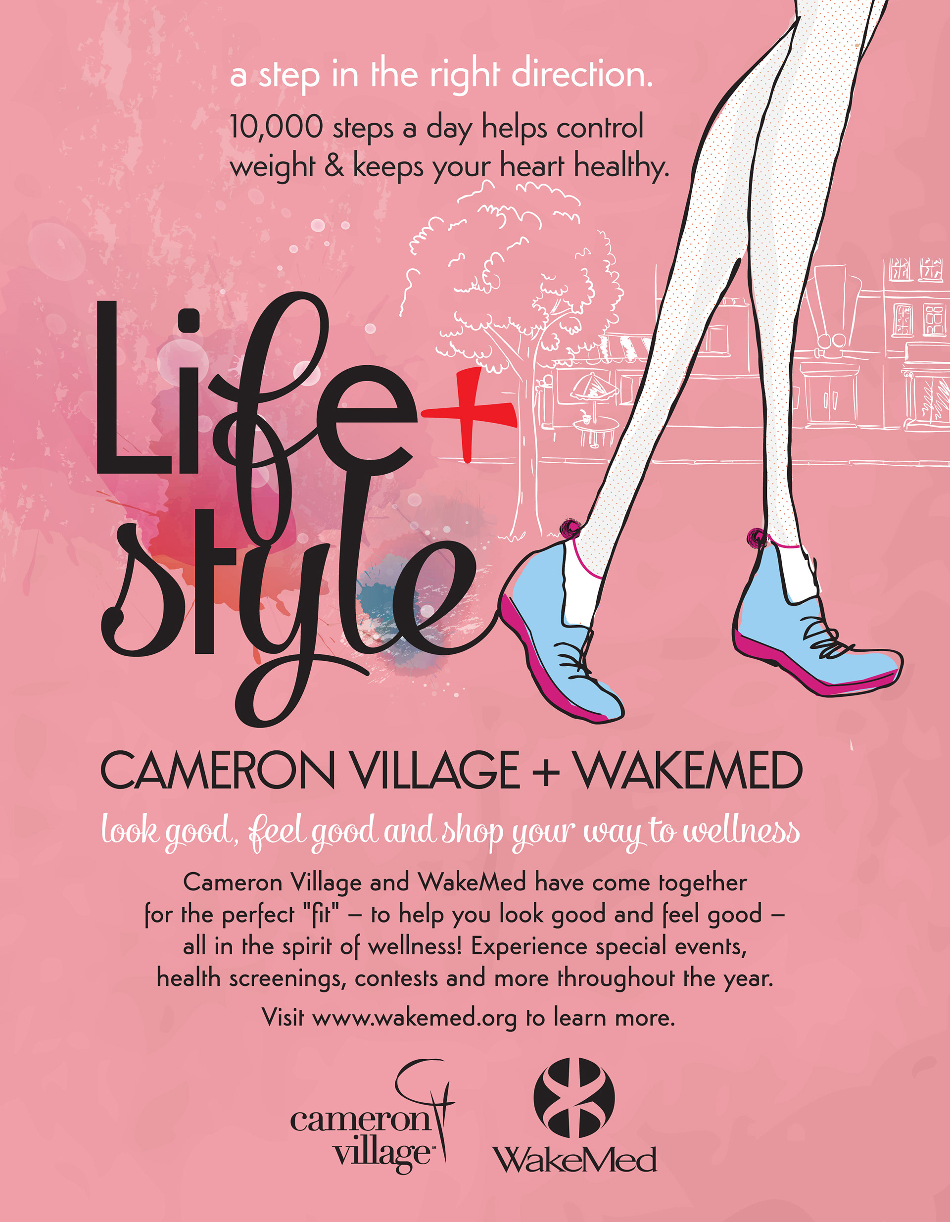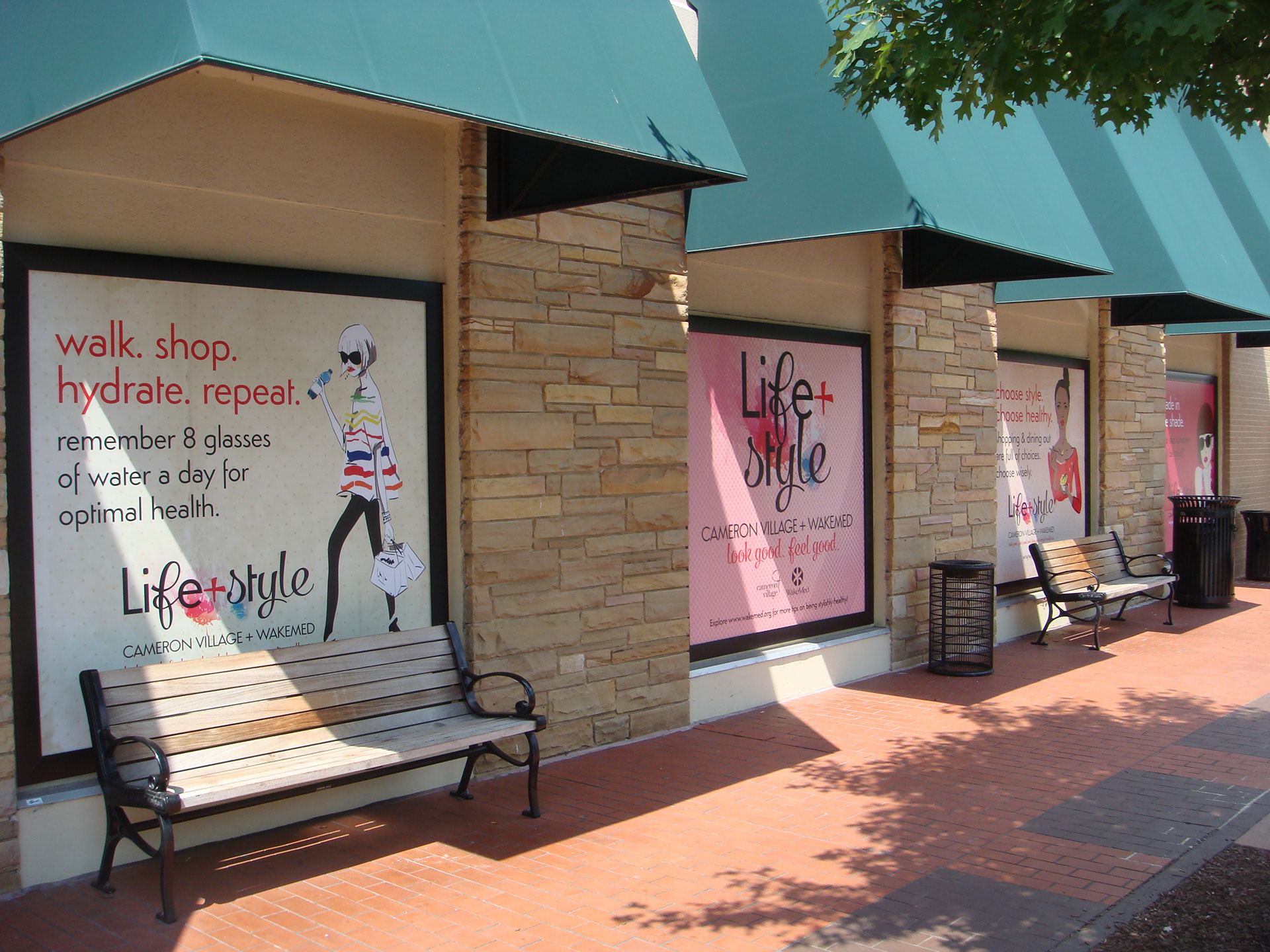 Integrated marketing campaign to promote health and wellness, partnered by Cameron Village and WakeMed Health & Hospitals. Printed graphics where displayed throughout the shopping center as well as through social media of both companies. Printed materials included store directories, billboards, pot wraps, pole banners.